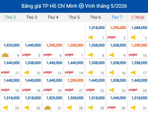 Bảng giá vé máy bay Vinh đi TP. Hồ Chí Minh tháng 5/2026 tại Senbay.vn